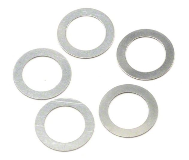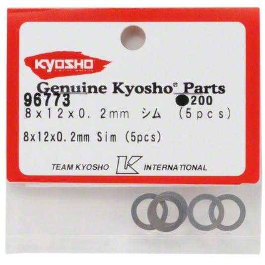 This is a pack of five Kyosho 8x12x0.2mm shims, used to adjust the end play on the hubs and driveshafts on the Kyosho MP9 and Inferno GT. You want to shim these parts so there is a slight amount of play, but be careful not to get them too tight, as it will cause pre mature bearing wear.
