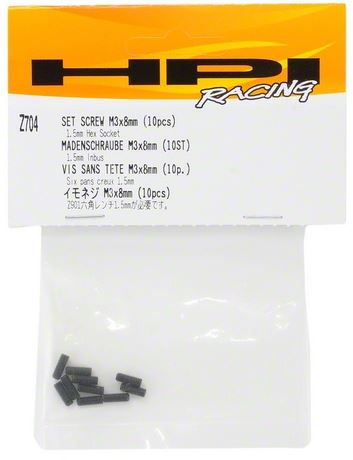 This is a set of ten replacement Hot Bodies 3x8mm set screws, and are intended for use with the Hot Bodies D8 and D8T 1/8 scale vehicles. These screws can also be used for any other application that requires a 3x8mm set screw. Part Compatibility: Hot Bodies 12X Hot Bodies D8T Hot Bodies Ve8 Hot Bodies D812 Hot Bodies D8 HPI Racing Vorza Flux HP HPI Racing Apache SC