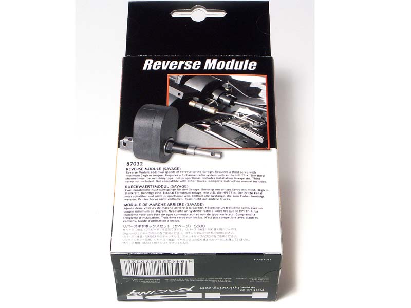 This is the optional reverse module for the HPI Savage family of monster trucks. All the necessary linkage are included with the module, which is fully assembled. Complete instructions show you how to quickly and easily install the Reverse Module with a servo you provide. Any standard size basic servo will work - a high torque/high strength servo is unnecessary. Part Compatibility: HPI Racing Savage HPI Racing Savage XL HPI Racing Savage X