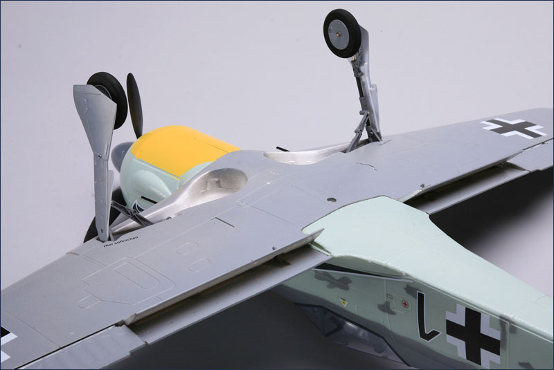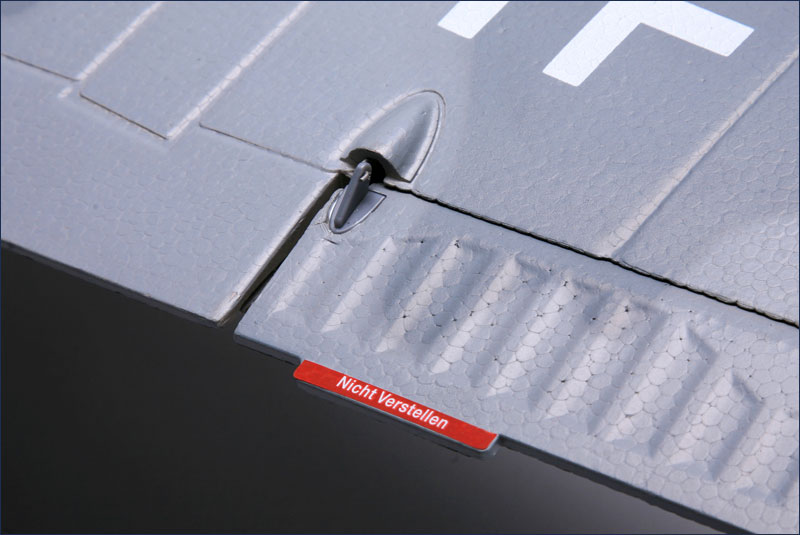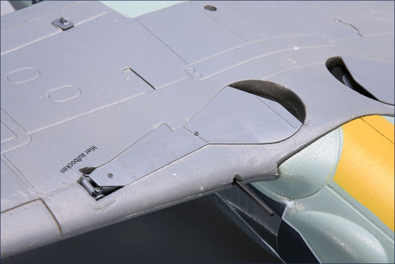 Die Querruder besitzen an der Hinterkante genau wie das Original eine feine Verrippung. Ebenso sind unzählige Stoßkanten, Luken und Deckel liebevoll am Modell nachgebildet. Die Anlenkung der Querruder und der Landeklappen erfolgt über jeweils ein Tragflächenservo, das in der Mitte der Tragfläche sitzt. Als Besonderheit verfügt die FW-190 über ein fertig im Modell eingebautes Einziehfahrwerk, das ebenfalls über ein Servo in der Tragflächenmitte angelenkt wird. Die Fahrwerksbeine verfügen über zwei Klappen, die die Schächte im Flügel komplett abdecken, wenn das Fahrwerk eingefahren ist.