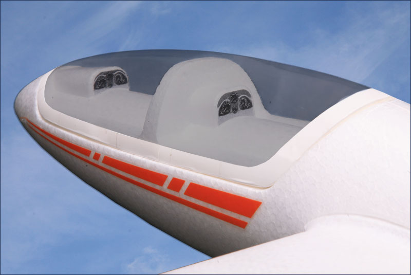 Geschäumte Formteile für Rumpf, Tragfläche und Heckleitwerk aus Hypodur®, Klapptriebwerk mit Brushless-Motor, LiPo-Brushless-Regler, 11,1V LiPo-Akku, 12V= Balancer-Ladegerät, 5 Micro-Servos, 5-Kanal 35MHz FM Fernsteuersystem