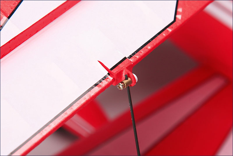 Die Querruder besitzen an der Hinterkante, genau wie das Original, eine feine Verrippung. Ebenso sind unzählige Stoßkanten, Luken und Deckel liebevoll am Modell nachgebildet. Die Anlenkung der Querruder erfolgt über jeweils ein separates Tragflächenservo. Die oberen Querruder werden durch 2 mm Carbonstäbe von den unteren Querrudern angelenkt.